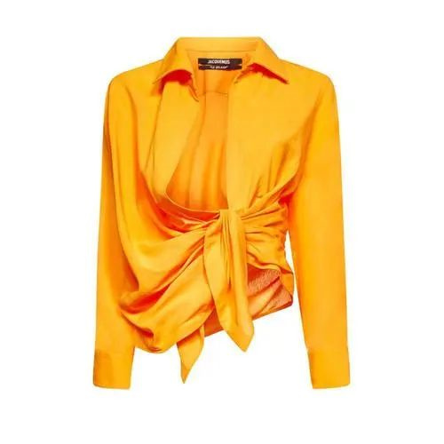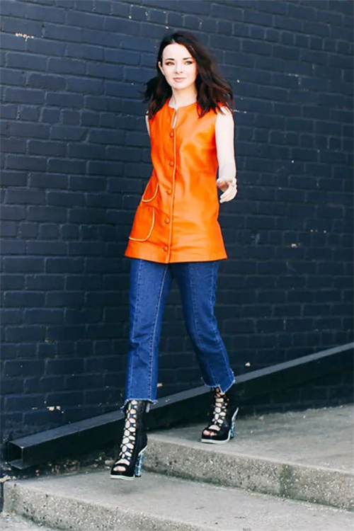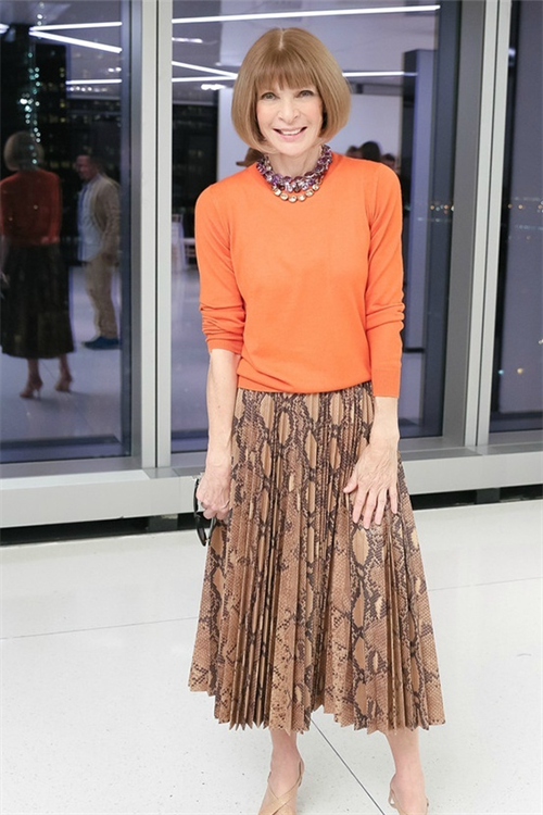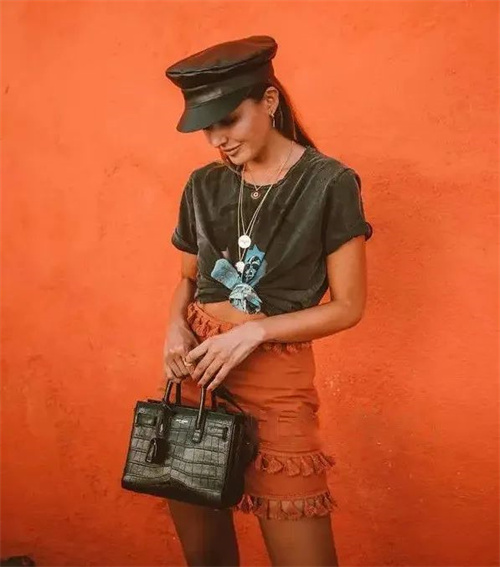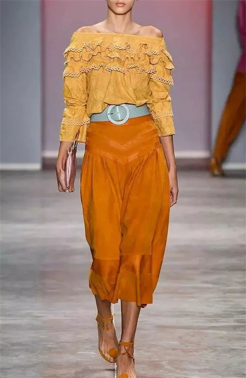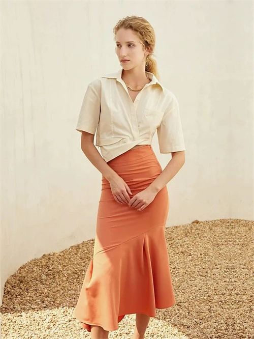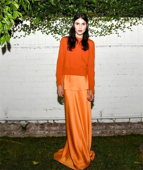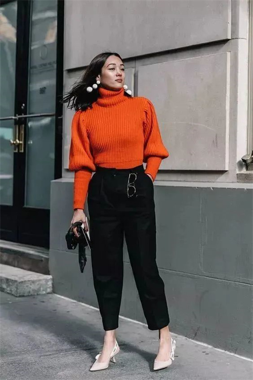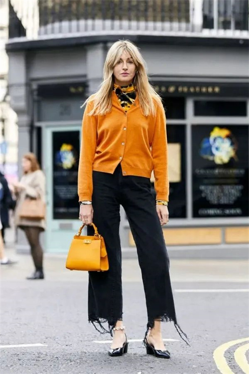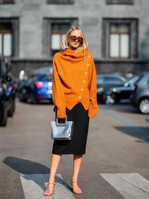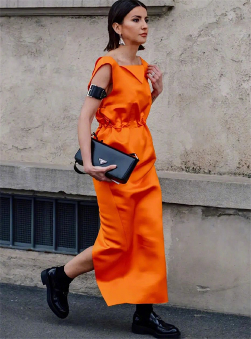 回到文章最初的那一身色彩搭配,如果把清淺柔和的橙色襯衫換成下面這種色彩飽滿、濃重的橙色,和黑色半裙搭配在一起,效果都會和諧許多。