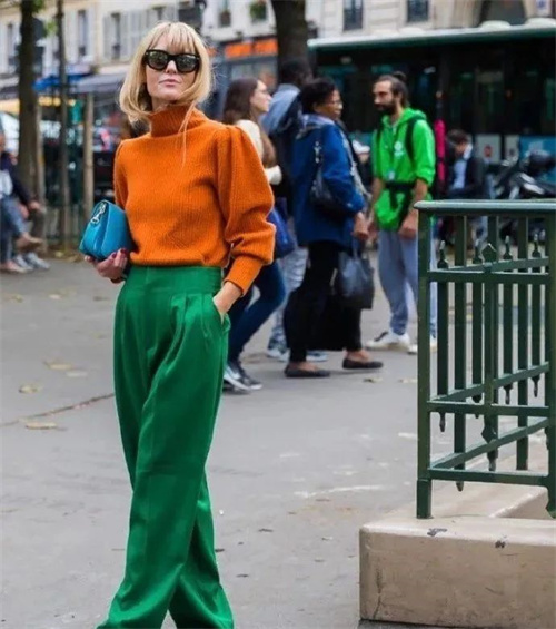 有人會說我不敢穿過于艷麗的橙色,那可以選擇適當降低飽和度,穿比較雅致的橙,怎么搭配更好看,例如下面左圖中降低了飽和度的橙色,用同樣低飽和度的苔綠色搭配,就很高級。