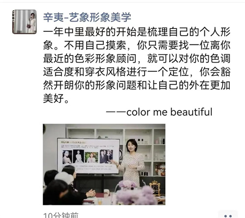 她想學(xué)一門技術(shù),但不知道學(xué)什么,她先網(wǎng)上報名學(xué)了配音,發(fā)現(xiàn)根本接不到單,也學(xué)了平面設(shè)計,在小縣城也找不到好工作。最后了解到色彩形象顧問課程,眼前一亮,因為小縣城里也有很多愛美的、愛消費愛打扮的女性,但是還沒有色彩形象顧問這個概念,她覺得一定會有市場,所以毫不猶豫報了名。