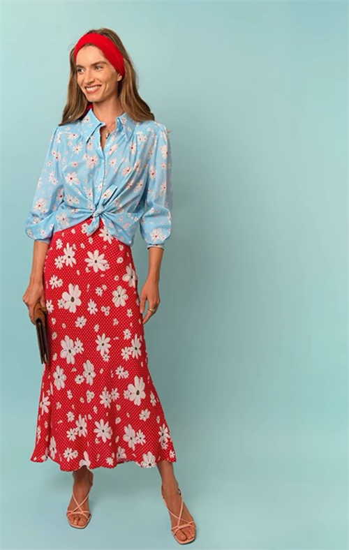 花衣服的美,還真是需要“伯樂”。很多花衣服本身并不難看,但總因為搭配而看起來怪怪的,顯得很生硬,最終呈現一種上半身是上半身、下半身是下半身各穿各的效果,就好像美麗的風景到了腰部,誒,沒了。
